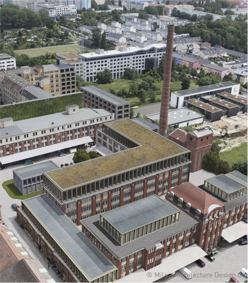 Quartiersentwicklung eines Gewerbeensembles mit Büros, Handwerkermeile und Produktionsstätten auf einer Geschossfläche von über 52.000 qm. Sanierung von unter Denkmalschutz stehenden Bestand mit ca. 32.000 qm (BGF) und Neubau von 20.000 qm (BGF)